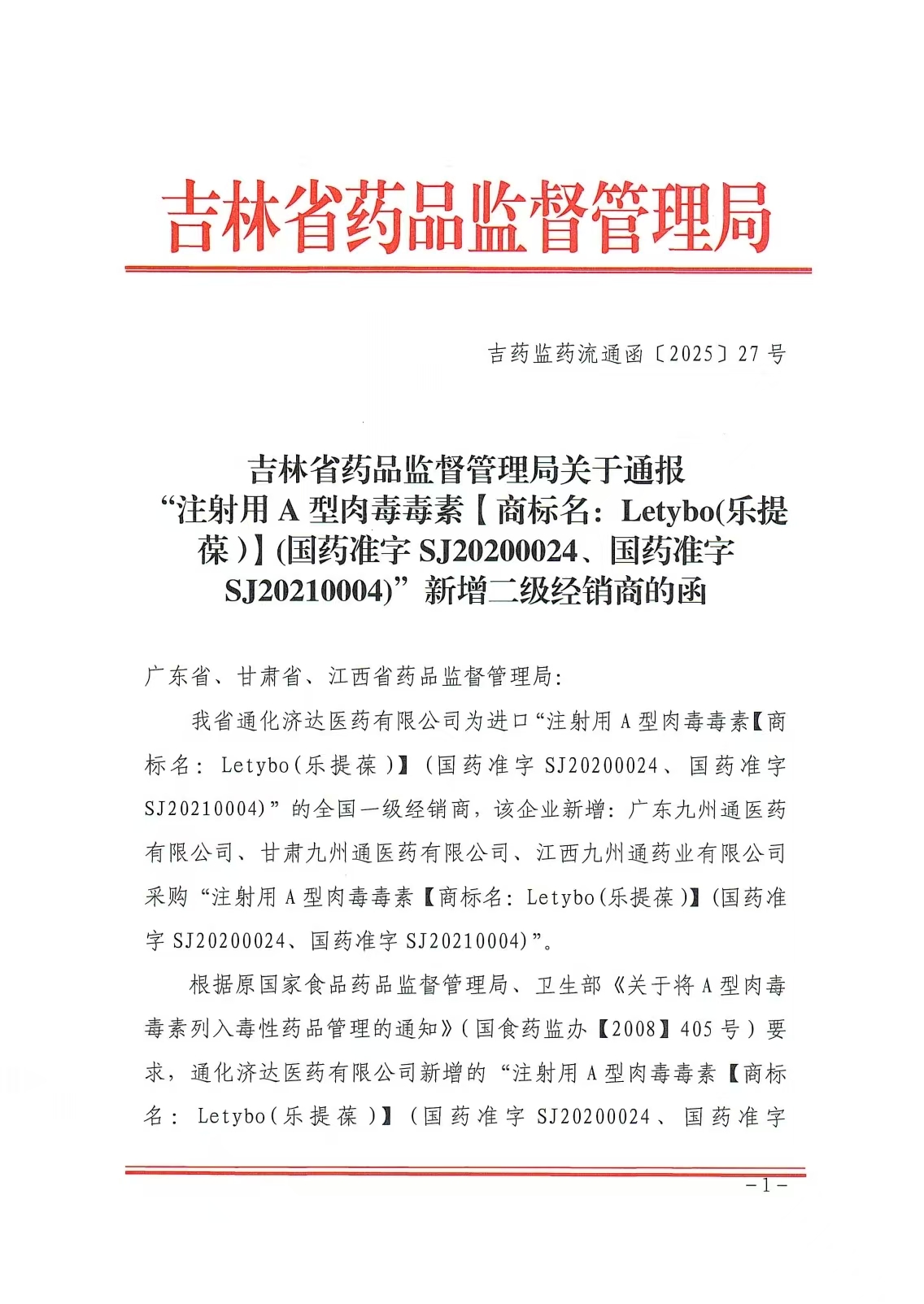 足球吧-足球推荐分析与交流论坛 关于通报“注射用A型肉毒毒素【商标名:Letybo(乐提葆)】(国药准字 SJ20200024、国药准字SJ20210004)”新增二级经销商的函