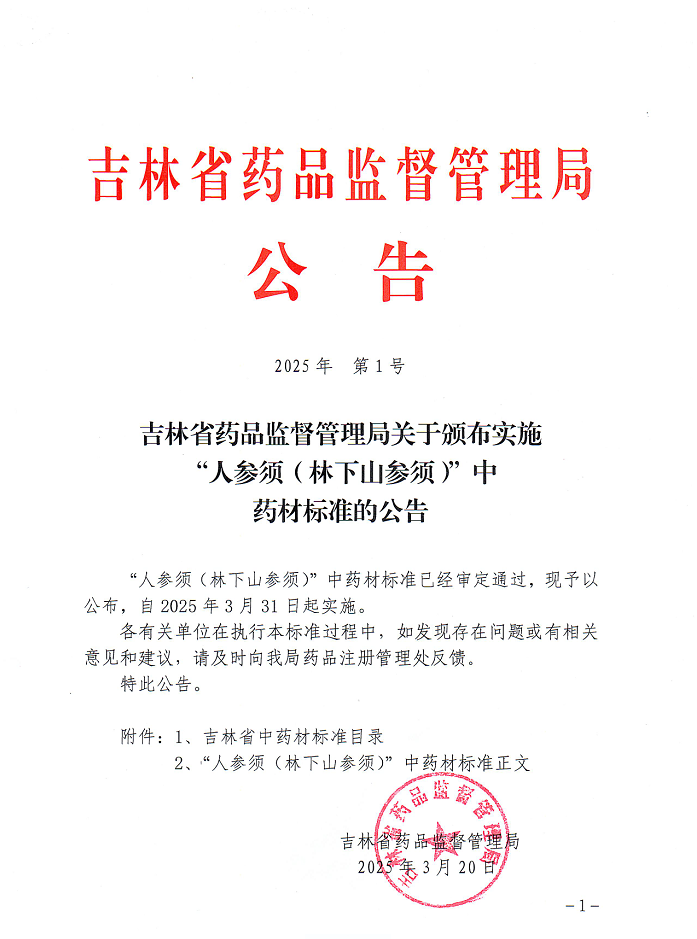 足球吧-足球推荐分析与交流论坛 关于颁布实施“人参须(林下山参须)”中药材标准的公告 2025年第1号